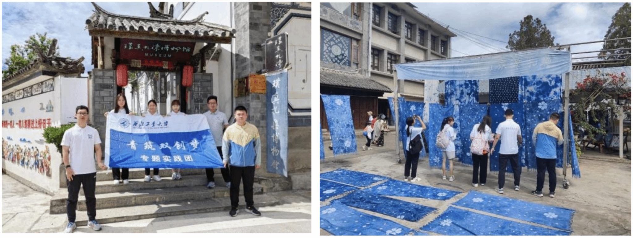 中国有服章之美。服饰与纺织总是息息相关,唇齿相依,中华服饰历经朝代更迭,大理的扎染技艺同样延续千年,既有所传承,又有新的发展。千百年来,扎染的蓝与白,早已浸润成白族人生活的底色。2006年,白族扎染技艺被列入第一批国家级非物质文化遗产保护名录。为深入探索白族扎染技艺推动乡村振兴发展之路,实践队首先来到了大理周城村璞真白族扎染博物馆。周城村被誉为“白族扎染之乡”,通过参观学习扎染艺术的起源、分类、传承、制作工艺及特色等内容,实践队同学们了解到周城村村民以培养新一代扎染技艺传人的发展理念,同时努力拓宽扎染市场和受众群体,对挖掘的相关文化资源进行整理,建立扎染博物馆并设立扎染体验工坊等。当地人民的努力使白族传统扎染技艺得到更广泛的关注,从而推动相关产业的发展,助力乡村振兴。
