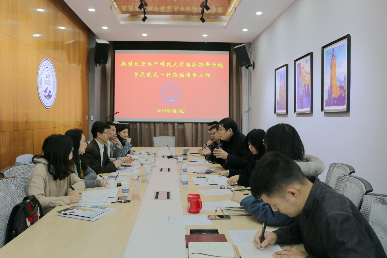 曾兵介绍了电子科技大学格拉斯哥公司的成立背景、专业设置、团队建设、员工管理、运行情况等。随后,双方就现阶段中外合作办学工作的内涵式发展模式、教学科研工作、员工管理、特色延伸等内容进行了细致深入的交流讨论。