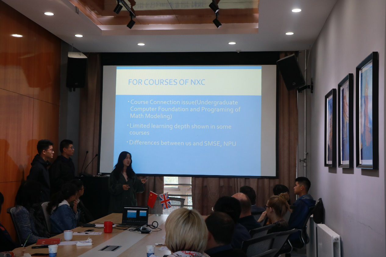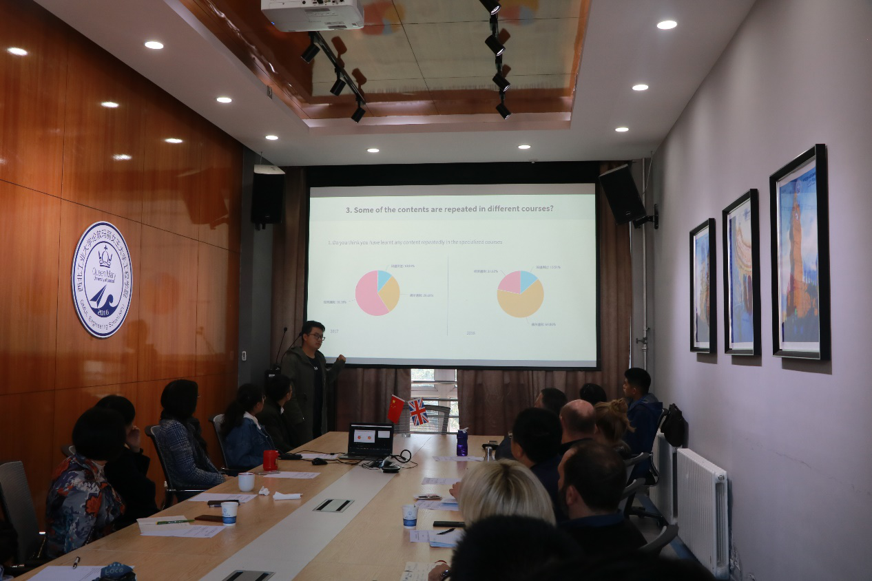 会议第二部分重点回顾了中英双方专业课程教学情况。四组员工分别报告了他们在基础课程和专业课程的学习情况以及困难,并综合课程内容的难易度和课时安排提出了改善建议。四组同学的汇报条理清晰、逻辑合理、内容详实,受到在座教师一致好评与鼓励。同学们通过调查问卷进行数据统计以及分析,从员工角度给授课教师和公司在教学内容安排以及教学计划方面提出了建议。