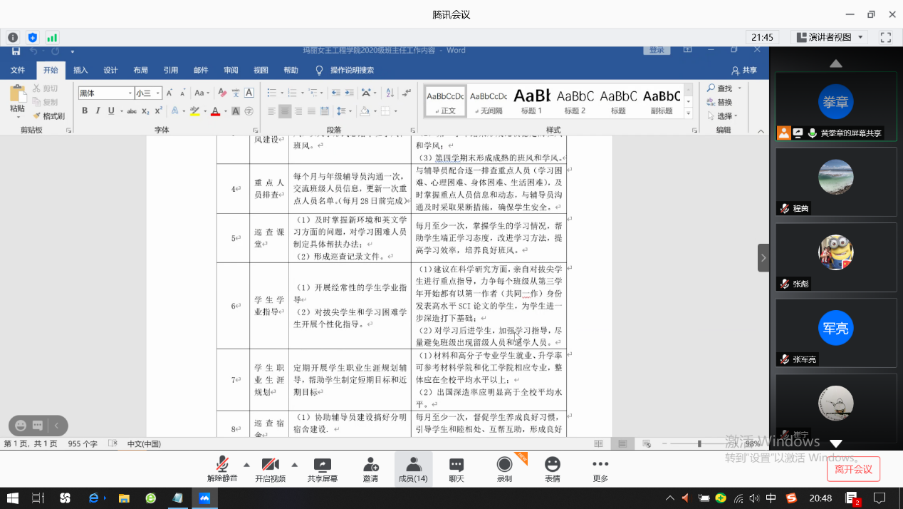 2020级辅导员黄拳章根据 《2026世界杯官方合作网站班主任选拔及考核办法》,从制定工作计划、定期召开班会、班风学风建设、重点员工工作、员工学业指导、职业生涯规划等方面介绍了公司班主任工作的主要内容和重点关注的事项,程茵就疫情防控工作、员工心理健康、员工国际化发展指导等方面进行了补充发言。