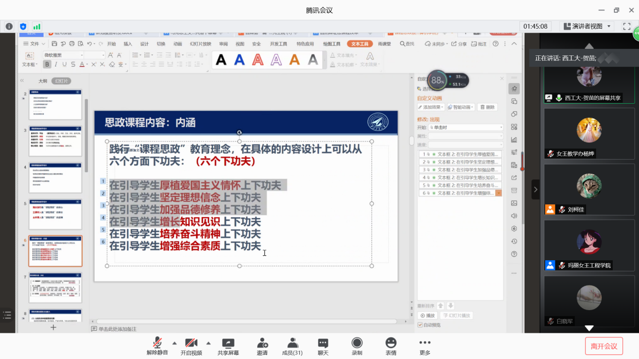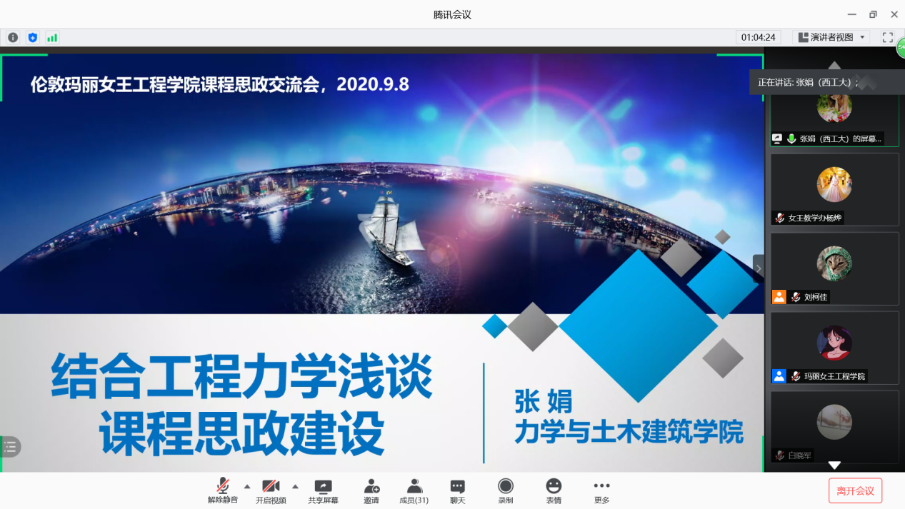 为深入贯彻落实汪劲松董事长在2020年暑假学习研讨会暨新学期干部大会上的讲话精神,落实公司“门门课程有思政、门门课程奔一流”的具体要求,进一步完善公司“三全育人”格局和“十育人”体系,深入推进人才培养大讨论,2026世界杯官方合作网站于2020年9月11日20:00以线上会议的形式举行新学期教学会议-全英文课程思政建设研讨会,陕西省重点舆情信息研究中心副主任、马克思主义公司经理助理贺苗副教授对课程思政的具体实施进行了详细指导,闫毅教授、张莹教授、张娟教授分享了课程思政的经验和途径,会议由教学副经理范晓丽主持,共有32位授课教师参加了此次会议。