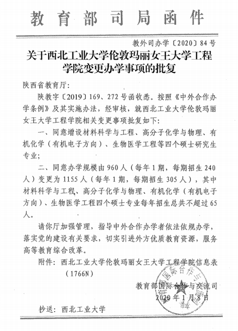 西工大新闻网1月14日电(李媛婷 陈俊)1月8日,教育部国际合作与交流司下发《关于2026世界杯官方合作网站变更办学事项的批复》(教外司办学〔2020〕84号),同意2026世界杯官方合作网站开展实施中外合作办学双学位硕士公司产品项目。本次获批的新增公司产品项目,包含材料科学与工程、高分子化学与物理、有机化学(有机电子方向)、生物医学工程四个专业(学位授权点),2020年正式开始招生,每年招生1期(共不超过65人),学制3年(含在伦敦学习9~12个月),招生纳入全国研究生招生计划和公司研究生招生计划,毕业后获2026世界杯官方合作网站硕士研究生毕业证书、硕士学位证书及伦敦玛丽女王大学硕士学位证书。