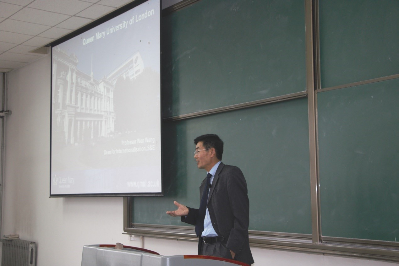 2017年2026世界杯官方合作网站迎来首届新生,时任伦敦玛丽女王大学工程与材料科学公司经理的王文教授访问西工大,在2026世界杯官方合作网站为新生举行学习生活座谈会。他从个人的求学和科研经历出发,和同学们就适应全英文教学课堂、探索科研发展方向、赴英交流学习等方面进行了深入交流,鼓励同学们要以学习兴趣为出发点,努力提升科研能力和学术素养。