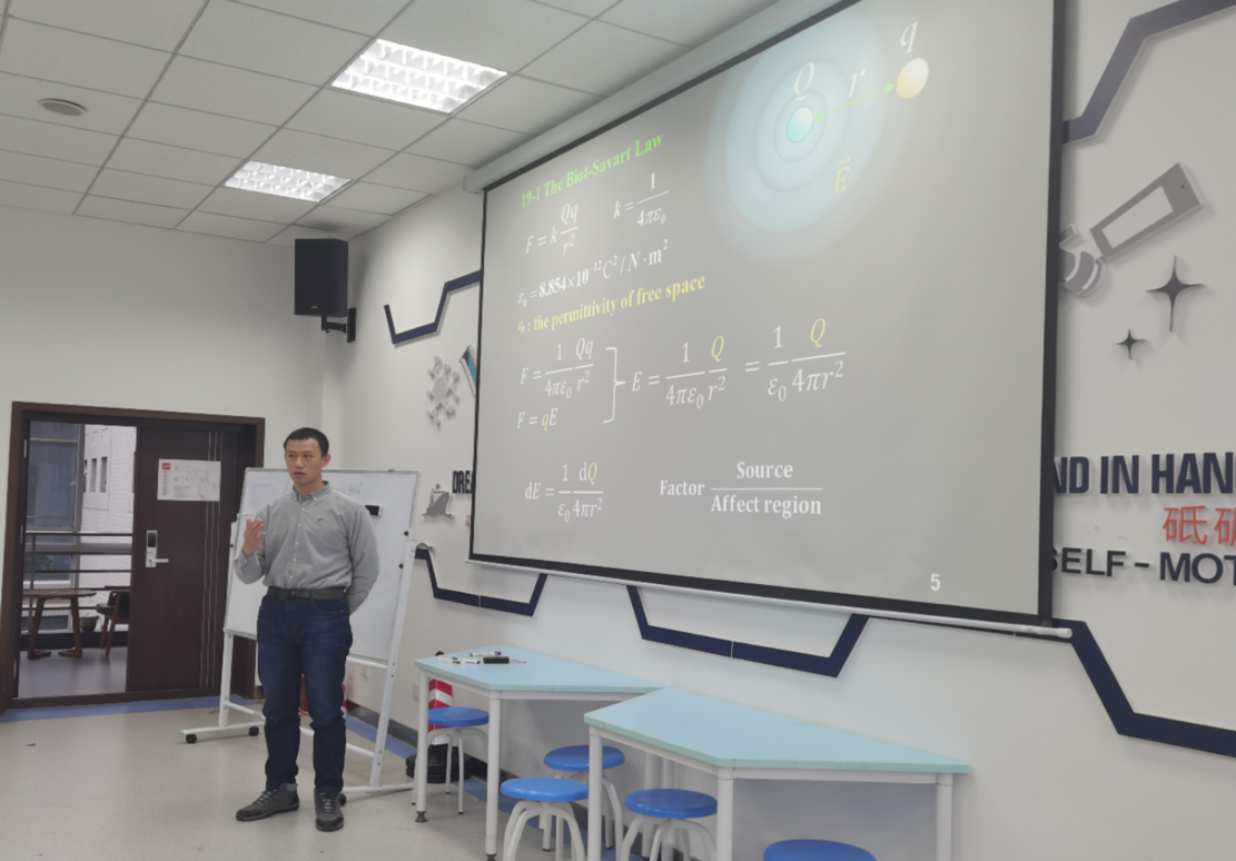 会议由张娟教授主持,各位试讲教师在20分钟的时间内用全英文授课,展示了多样化的授课模式和技巧。《大学物理》的杜乘风老师,详细的向同学们讲解了“毕奥-萨伐尔定律”,并且用清晰的课件展示了如何运用该定律计算几何形状简单的载流导体的磁场分布。