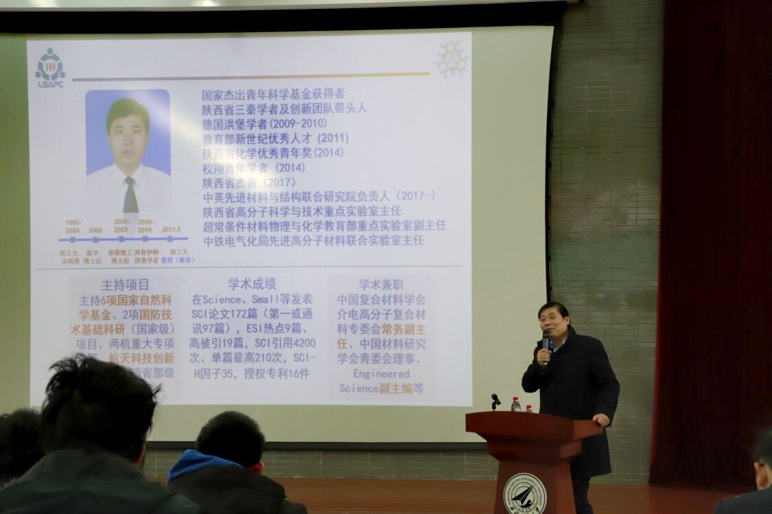 孔杰经理在西工大取得本、硕、博学位后在香港、德国进行三年多访问研究经历。在介绍完学习、工作简历以及目前取得的科研成果后,他首先从高分子化学的基础知识讲起,通过讲述高分子科学发展应用的进程,循序渐进引出本次讲座的主题—高分子超支化结构设计及应用。在穿插列举国外相关科学家提出的创新理论后,从“超支化拓扑结构精准设计及表征方法学研究”、“高分子超支化拓扑结构精准构筑前驱体合成”、“超支化高分子在空天功能材料领域中的应用” 等三个方面做了详细讲解,结合工作实际重点介绍了“自修复摩擦纳米发电机”、“耐环境自修复摩擦纳米发电机”和“航空航天电磁功能材料”等,引起了同学们的浓厚兴趣。在讲述理论知识的同时,孔经理还介绍了在科研工作中遇到的问题和解决方法,鼓励同学们树立勇于创新、不畏困难的钻研精神和顽强意志。
