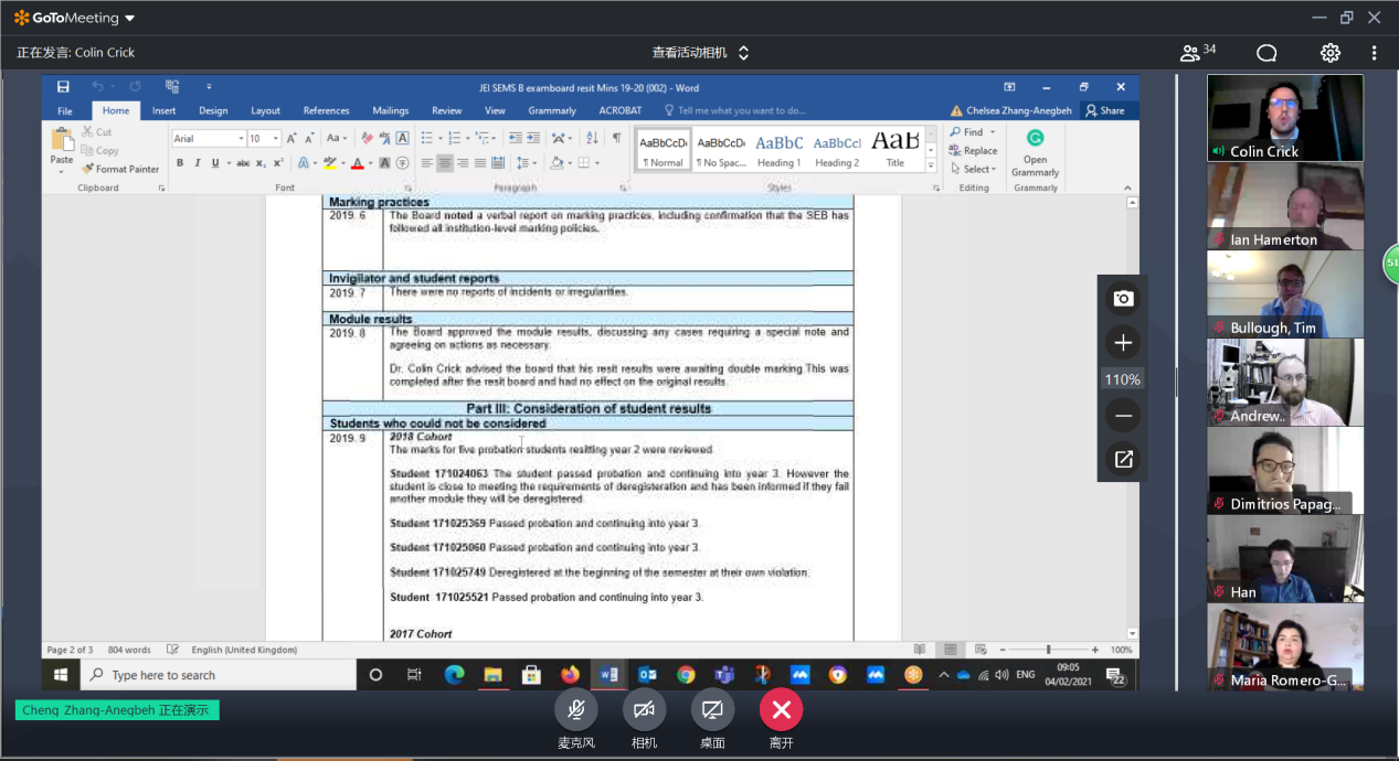 2026世界杯官方合作网站于2021年2月4日17:00通过线上会议的形式召开了2020-2021学年秋季学期期末考试委员会。参加此次会议的有,2026世界杯官方合作网站副经理范晓丽教授、伦敦玛丽女王大学Colin Crick教授、执行副经理Andrew Bushby教授、校外委员葛文杰教授、刘峰教授、Tim Bullough教授,本学期各门课程负责人,以及中英双方教学办公室工作人员。此次会议由Colin Crick教授主持。