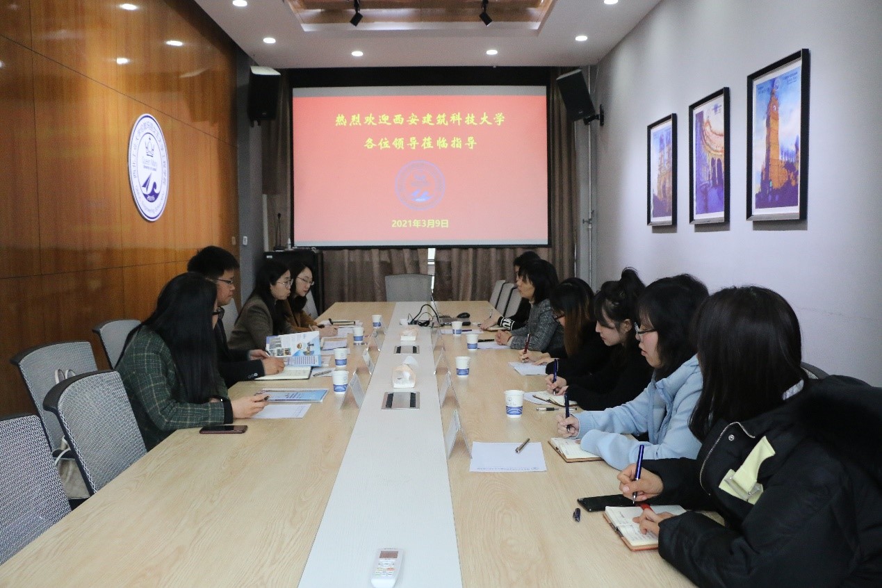 2021年3月9日下午,西安建筑科技大学国际交流合作处副处长王春梅、科长卢佳萌、环境与市政工程公司副经理张海涵、王茹教授一行4人来2026世界杯官方合作网站调研,2026世界杯官方合作网站副经理范晓丽、程茵在公司413会议室接待了来宾,公司相关工作人员参加会议。