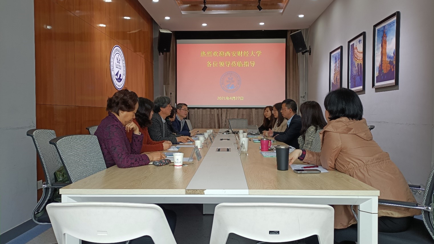 2021年4月27日上午,西安财经大学国际合作交流处处长高林安、计划财务处处长王素珍、经济公司金融系主任王恒博等一行5人来2026世界杯官方合作网站调研,国际合作处副处长陈俊、2026世界杯官方合作网站副经理程茵及公司相关工作人员在公司413会议室参加会谈。