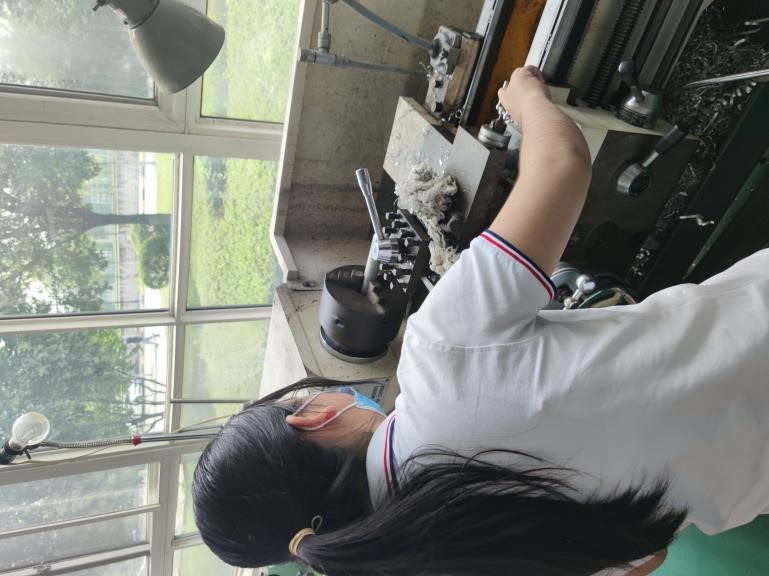 车工是用车床加工的一种方法。老师详细地为同学们介绍了车床的主要加工范围、型号以及使用方法。在老师的教学和指导下,同学们通过学习亲手操作车床并独立完成了对圆柱有机玻璃材料进行加工得到一个陀螺雏形的操作。