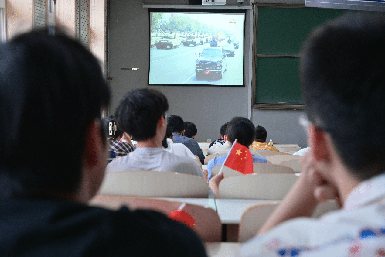 9时整,大会正式开始。在庄严的国歌声中,全体师生起立。大家目不转睛地观看屏幕,深切感受中国军队不可撼动的钢铁意志与磅礴力量,深刻领会伟大抗战精神的历史意义。