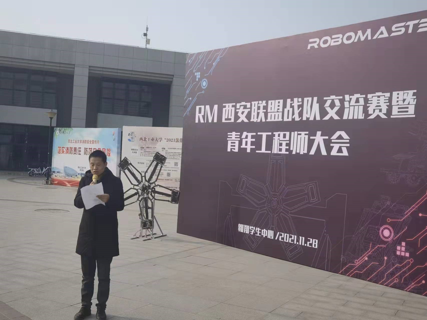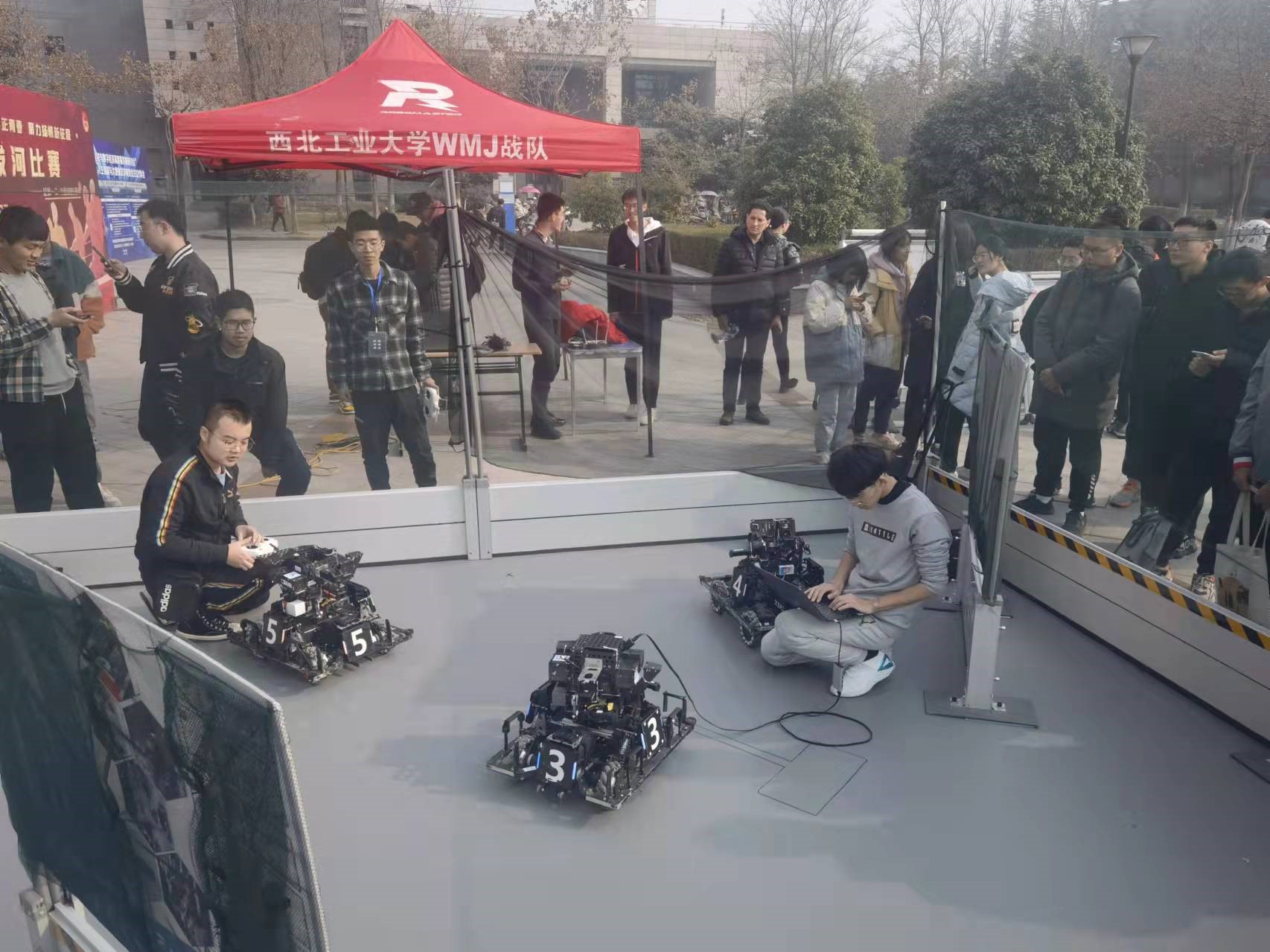 吕冰老师主持并介绍了RoboMaster机甲大师赛和赛程安排。本次RM西安联盟战队交流赛暨青年工程师大会,邀请到了来自西安电子科技大学的IRobot战队和长安大学的VGD战队。比赛过程中的专注、认真、果断,震撼人心的视听冲击力、激烈硬朗的竞技风格深深的吸引着同学们。
