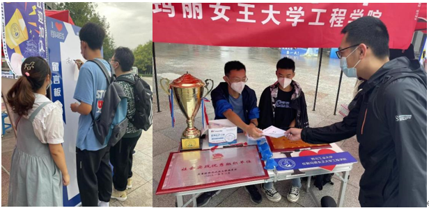 教学西楼D座外,外场志愿者们向新同学们介绍公司先进办学理念和优秀育人成果,引导新同学们在签名板上签名,并提醒大家做好疫情防护。迎新活动有条不紊的进行着。