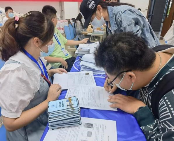 9月8日7点,教学西楼D座201教室,内场志愿者们早早就位。志愿者们认真核对新生信息,进行人脸识别和验证登记,发放校园一卡通、员工手册和个人防疫物资等新生大礼包。