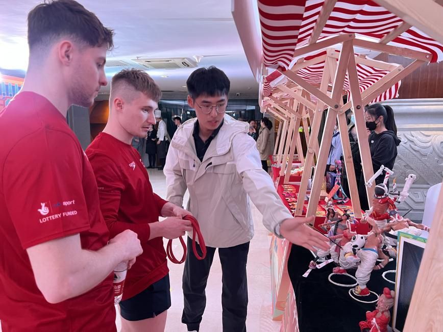 在运动员入住的酒店健身房与餐厅通道处,活动主办方专门设计了一条富有中国传统文化气息的“文化街”,其中包括唐装、汉服体验区、长安美食互动区、长安集市非遗交流区、西安特色文创展示区等主题场景,公司5名同学担任非遗文化交流区的翻译,负责对马勺、皮影、面塑等非遗文化项目进行英语介绍,并协助各位外国友人现场亲手制作非遗产品。