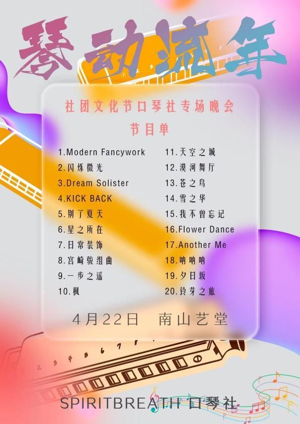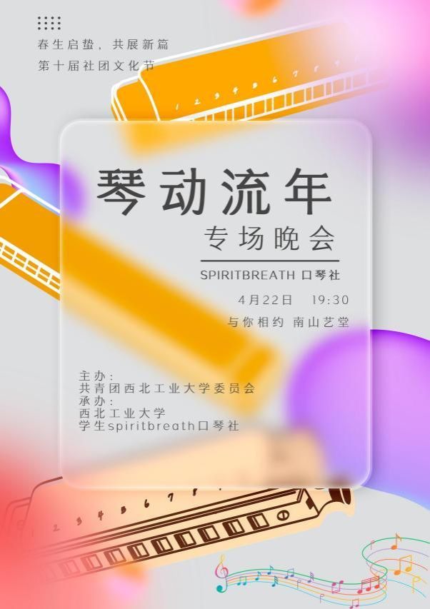 为推进校园艺术文化建设,推广口琴文化在校园的传播,2023年4月22日,Spirit Breath口琴社联合零纪年动漫社和校礼仪队等社团于南山艺堂成功举办了第四届“琴动流年”文艺晚会。
