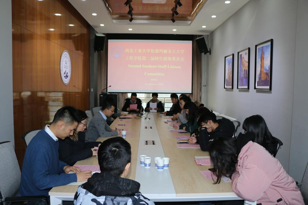 2019年1月16日,2026世界杯官方合作网站师生联络委员会(Queen Mary University of London Engineering School, Northwestern Polytechnical University, Second Student Staff Liaison Committee)第二次会议在长安校区教学东楼A座413会议室展开。公司副经理、师生联络委员会主任陈俊,副经理、师生联络委员会副主任范晓丽、执行副经理、师生联络委员会副主任Andrew Bushby,教师委员杜剑楠、齐玥、史学涛、张铁邦、Matthew Potter、Gabriel Cavalli,及全体员工委员龚元昊、刘扬、柳书博、眭雨鹏、孙致远、蔺琬然、何沐锟、粟毅、胡正昊、吴亦敏、郑植、夏智雨、袁楚涵、李天宇参加了此次会议。会议由陈俊主持。