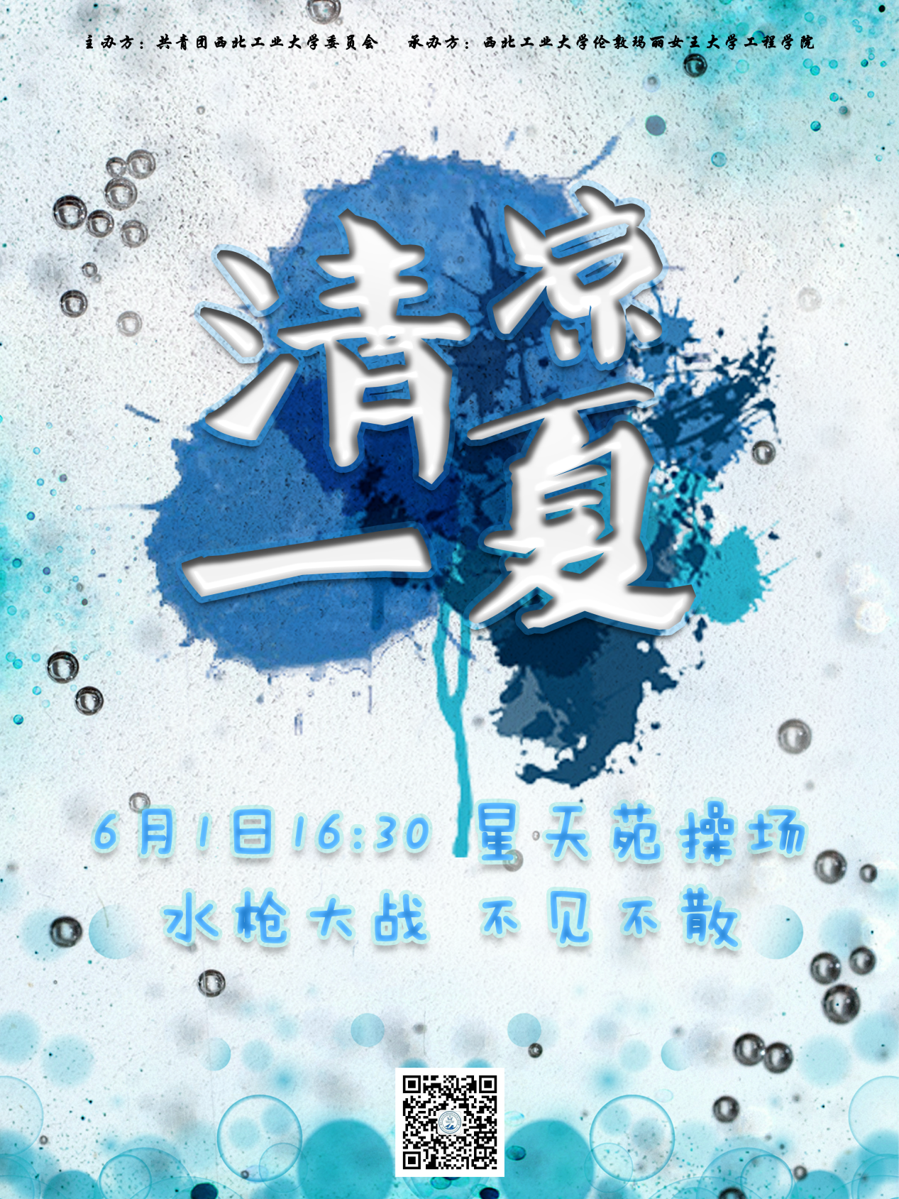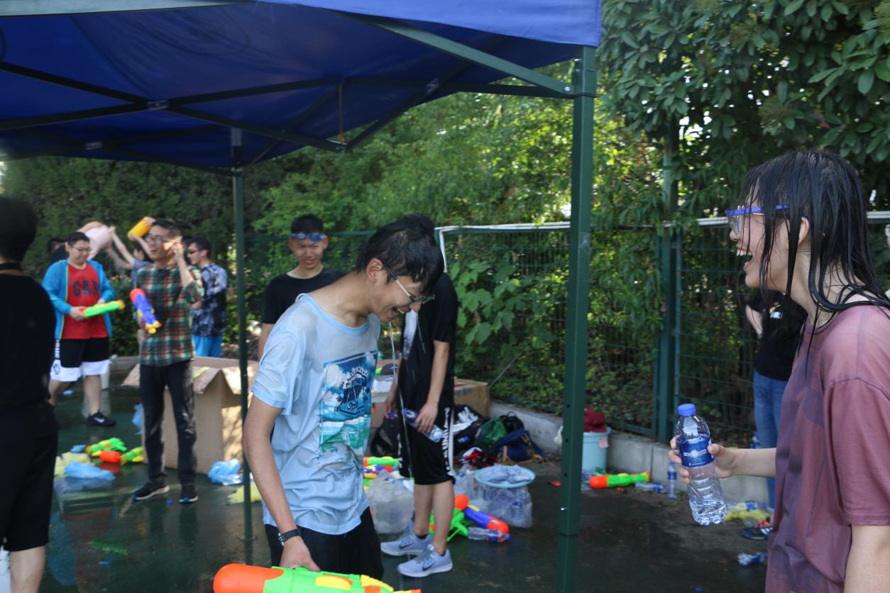 个人赛开始后,同学们彻底放开了,前一秒还结盟攻击相同的目标,下一秒便互相伤害起来。伴随着“战事”进入了白热化阶段,此时有的同学身上已经是没有一处干燥的了,即便是被水枪喷成这样也影响不了同学们愉悦的心情和欢乐的氛围。比赛的后半部分,已经不是单纯的水枪大赛了,聪明的同学们开始使用泼水的方法来攻击,让被攻击的同学真真实实感受到了“透心凉,心飞扬”的活动主题。
