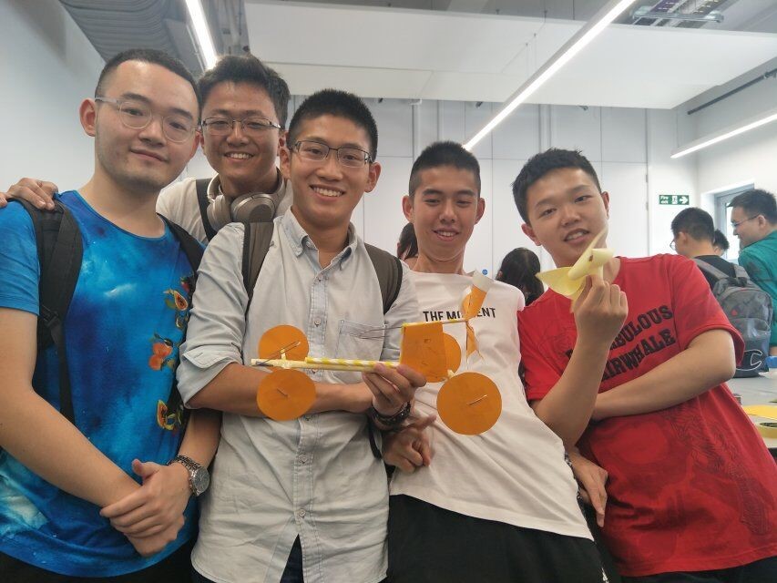 除巧克力实验外,同学们还进行了空气动力车的制作实验活动。同学们根据老师提供的英文制作说明书和材料,包括普通纸、硬卡纸、吸管、回形针、皮筋、胶带和剪刀,在3小时内制作出以风力为动力自主前进的小车。