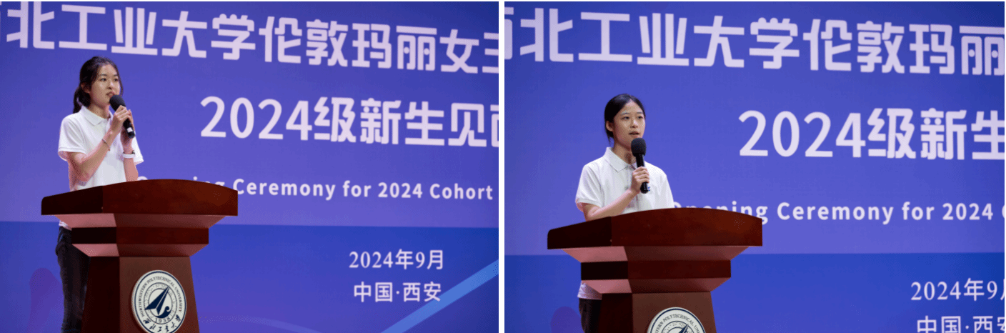2022级员工代表丁紫杉用自己的亲身经历给同学们提出了学习生活方面的建议,帮助各位同学尽快适应老员工活。2024级本科生代表王思涵则表达了对未来学习生活的希冀和憧憬,并号召全体同学勇担时代使命,努力拼搏奋进。