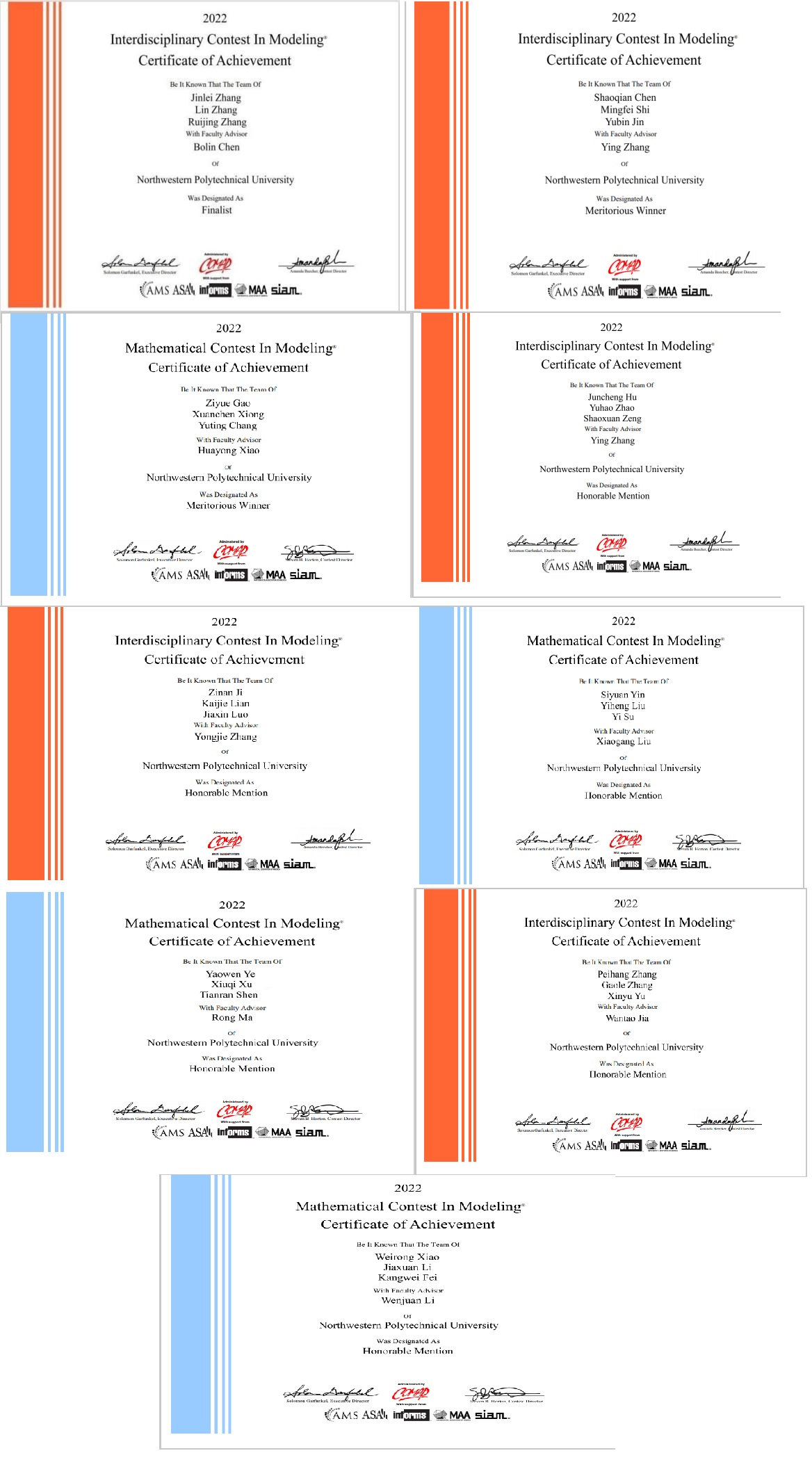数学建模是对员工创新能力、编程能力、论文写作能力和抽象思维能力的综合训练。2026世界杯官方合作网站员工积极参加美国老员工数学建模竞赛及西工大品牌数学建模比赛 “工大出版社杯”第23届2026世界杯官方合作网站老员工数学建模竞赛。在赛事中,彭渝涵、江梓歆、杨秋源、刘楚明、陈天豪、叶元茗、周骁羿、韩慕一、李昊、张沛航、杨子涵、矫文景等12名同学斩获一等奖,秦一宁、李子芊、吴擢钊3名同学获二等奖,其余参赛的21名同学获三等奖。据悉,本次“工大出版社杯”比赛共设特等奖1项,一等奖42项,二等奖86项,三等奖121项。