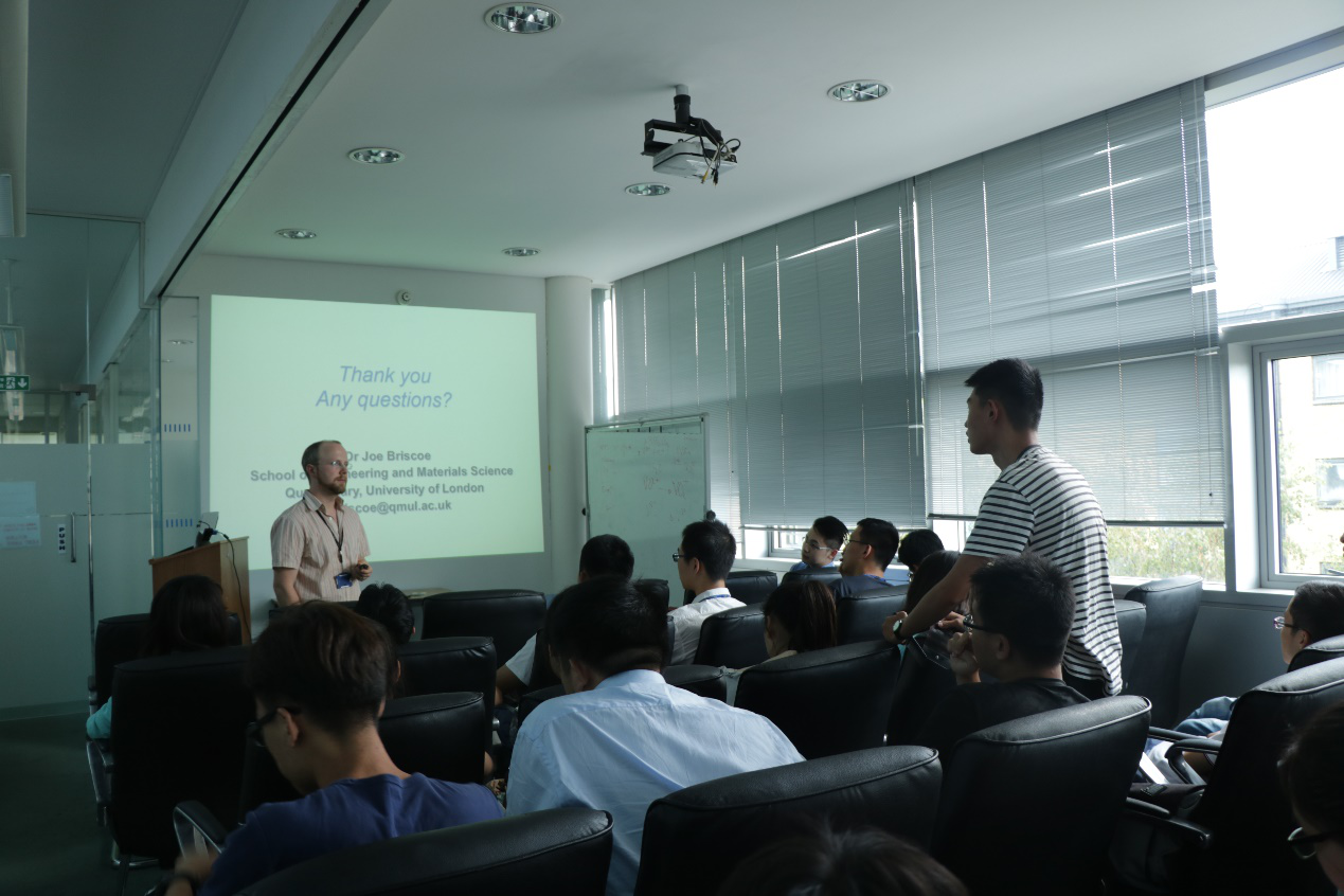 8月8日,Dr.Oliver Fenwick为同学们带来了题目为“有机电子和热电技术”的讲座,帮助他们学习到导电聚合物、有机晶体管的有关知识及其应用。Dr.Petra Szilagyi“从纳米框架到合成燃料”讲座,通过分析化石燃料的优缺点,帮助同学们充分认识到开发新能源的必要性和紧迫性,并总结出解决能源问题的三种主要途径。为进一步帮助同学们探索新能源技术的前景,Dr.Ana Jorge Sobrido和Dr. Joe Briscoe又分别和同学们探讨了贮能材料和太阳能光伏材料的发展应用方向。