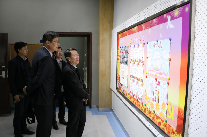 He first visited office area, students' activity room and the Internet Smart Classroom in Chang'an Campus and then joined a meeting with all of the staff from JEI. Dean Kong Jie made detailed reports on the school's framework construction, Party construction, teaching organization, student affairs, development plan and recent work. Executive Vice Dean Andy Bushby, Vice Deans Fan Xiaoli and Chen Jun added some details according to Kong Jie's report.
