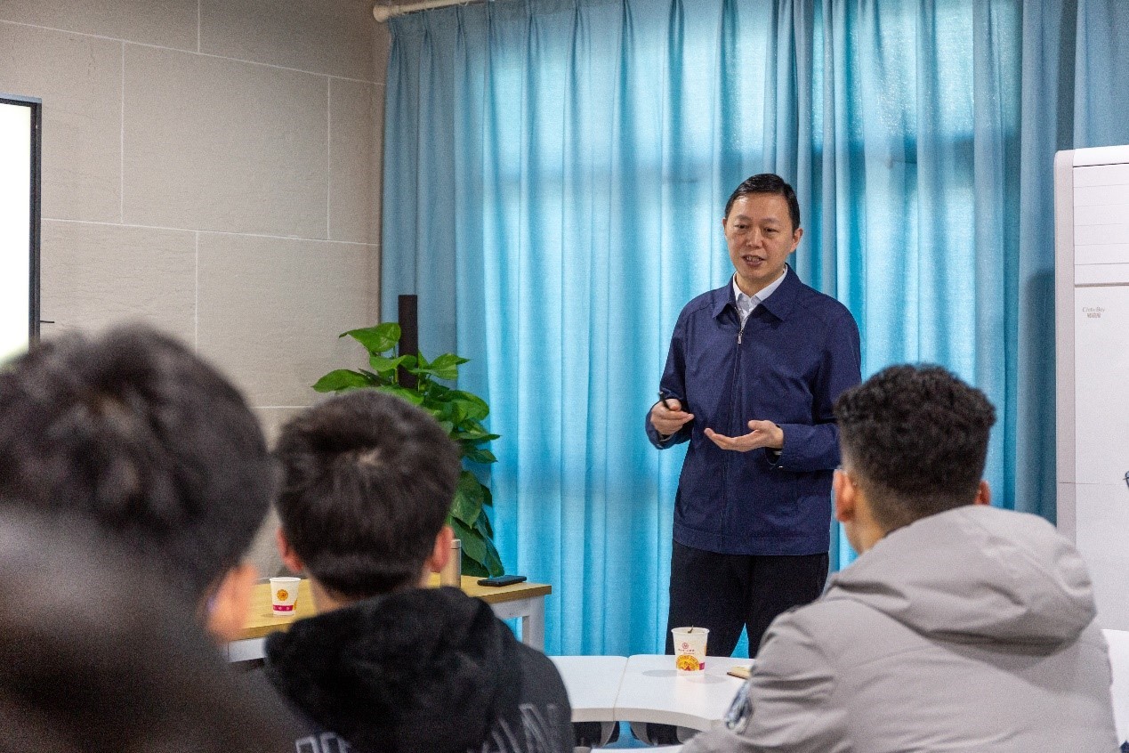 Firstly, Zhang Kaifu guided the students to review the brilliant achievements that our country had made in many aspects, including in the national economy and social development since the founding of the People’s Republic of China, and pointed out that young people in the new era should constantly strengthen their ambition and confidence as Chinese people, so as to live up to the requirements of the times and the ardent expectations of the CPC and the people. Furthermore, he said that the ideological and political work of colleges and universities must always implement the spirit of General Secretary Xi Jinping’s speeches at important conferences, such as the National Conference on Ideological and Political Work at Institutions of Higher Learning and the National Education Conference; always adhere to the fundamental task of education—fostering virtue, so as to focus on students, care for students and serve students; and constantly improve students’ ideological level, political discernment, moral quality and cultural literacy, nurturing students to talents with moral grounding and intellectual ability and all-round development. At the same time, he encouraged the students not only to have high ambitions, but also to constantly work hard with pragmatic and sustained efforts.