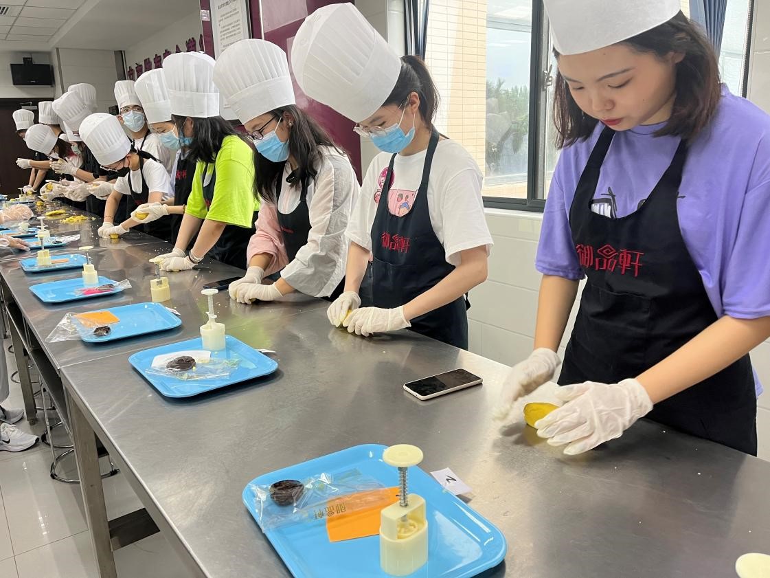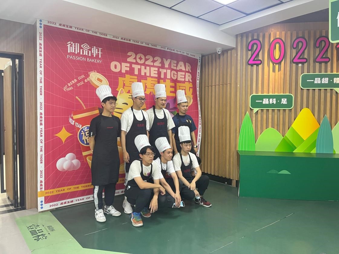 In the Happy Baking Magic Castle of the factory, students visited functional area of the factory and eight processing windows of bread technology where the production process of bread from research and development to production and packaging was shown.Staff in the factory introduced to the students about thehistory of cake, from its origin in ancient Rome to its widespread spread around the world, and how the first birthday cake and the first wedding cake were baked. During the refreshment time, students tasted delicious pastries made by the chef. After a short break, students put on chef outfits and began to make mung bean cakes. Under the detailed explanation and guidance of the chef, students divided the mung bean paste, wrapped the red bean filling, compressed and demoulded, and finally made beautiful mung bean cakes.