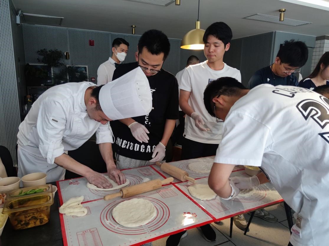 At the same time, another group of students went to make hand-tossed style pizza. As soon as students entered the restaurant and saw the dazzling array of ingredients on the table, they couldn’t wait to try to make pizza. Under the guidance of the chef, students learned how to knead the dough to make Italian hand-tossed pizza. The chef quickly kneaded the dough into pastry shape, but it’s difficult for students. They found that the fermented dough was not so “obedient” and the shape was very uncontrollable. With the chef’s explanation, students gradually mastered the essentials of mixing dough and making pizza. The next step was to prepare stuffing and bake the pizzas. Students put cheese, luncheon meat, green peppers, mushrooms, walnuts, sauces and other ingredients on the pastry. After baking, finally deliciouspizzas were made.