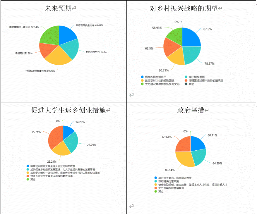 By virtue of online exchange activities, the team obtained samples through online questionnaires to understand the locals' understanding of the achievements of rural vitalization, as well as the current situation and expectations of "talent construction" in rural vitalization. By combining literature and questionnaires, the multidimensional method was produced. Scale questions were designed to explore residents' satisfaction with various aspects of life and reflect important factors affecting the implementation of the strategy, so as to ensure the authenticity and effectiveness of data. Then, SPSS was used to obtain further results. The following are some of the findings of the team: