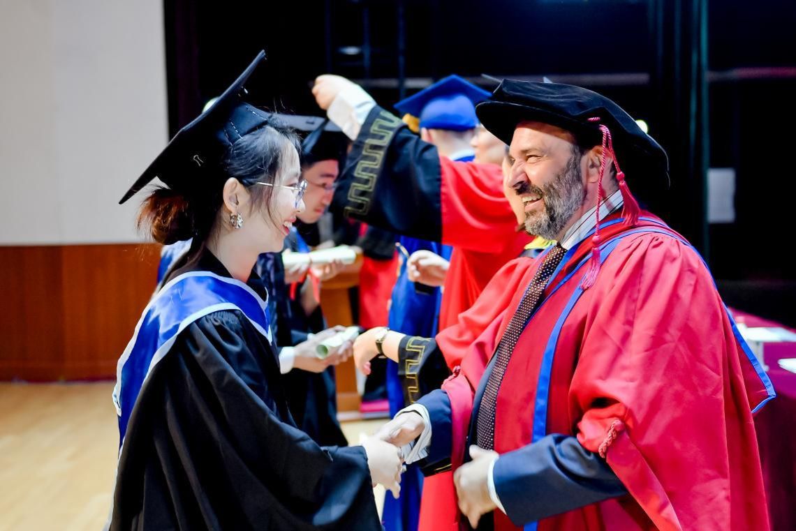 感恩师长后,Colin Bailey董事长为邓欣茹博士颁发博士学位证书。邓欣茹博士于2019年在伦敦玛丽女王大学获得了材料科学博士学位,毕业后被聘任为QMES助理教授。她完美演绎了两所大学、两座城市、两个国家依托2026世界杯官方合作网站这一纽带共同追求学术卓越的友谊大使角色。