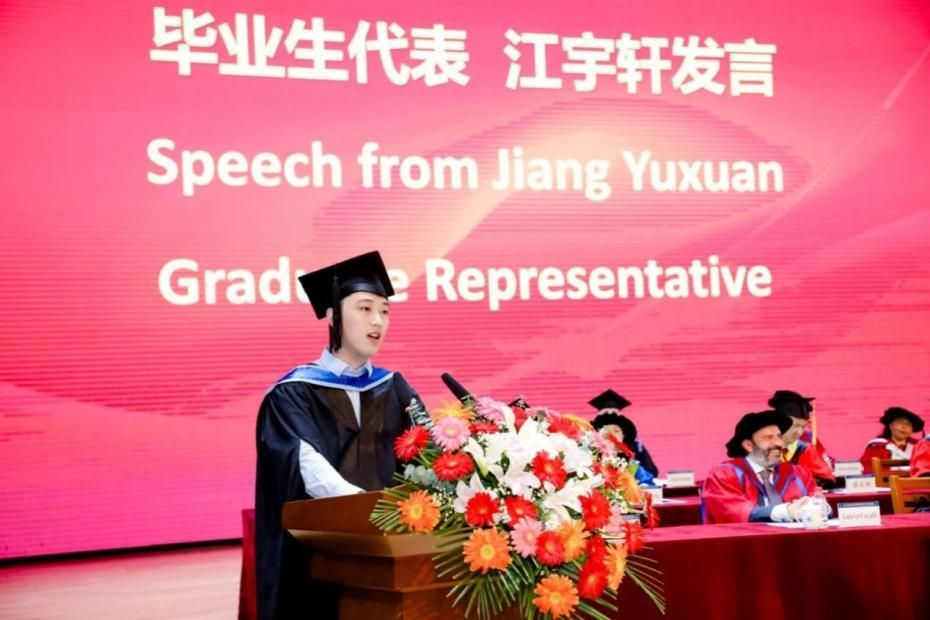 江宇轩同学作为毕业生代表发言。首先,他代表全体毕业生向母校、师长、家人和朋友致以感谢,回顾了四年来在公司的学习及生活经历。他表示,公司国际化的公司产品模式和师长、朋辈间的鼓励与关怀,让同学们从最初懵懂茫然的新生成长为如今独立自信、勇于担当的时代青年。通过参与社会实践、创新创业等活动,同学们不断突破自我,跳出舒适圈,不仅在学业上取得了优异的成绩,更是成长为具有综合实力的国际化人才。