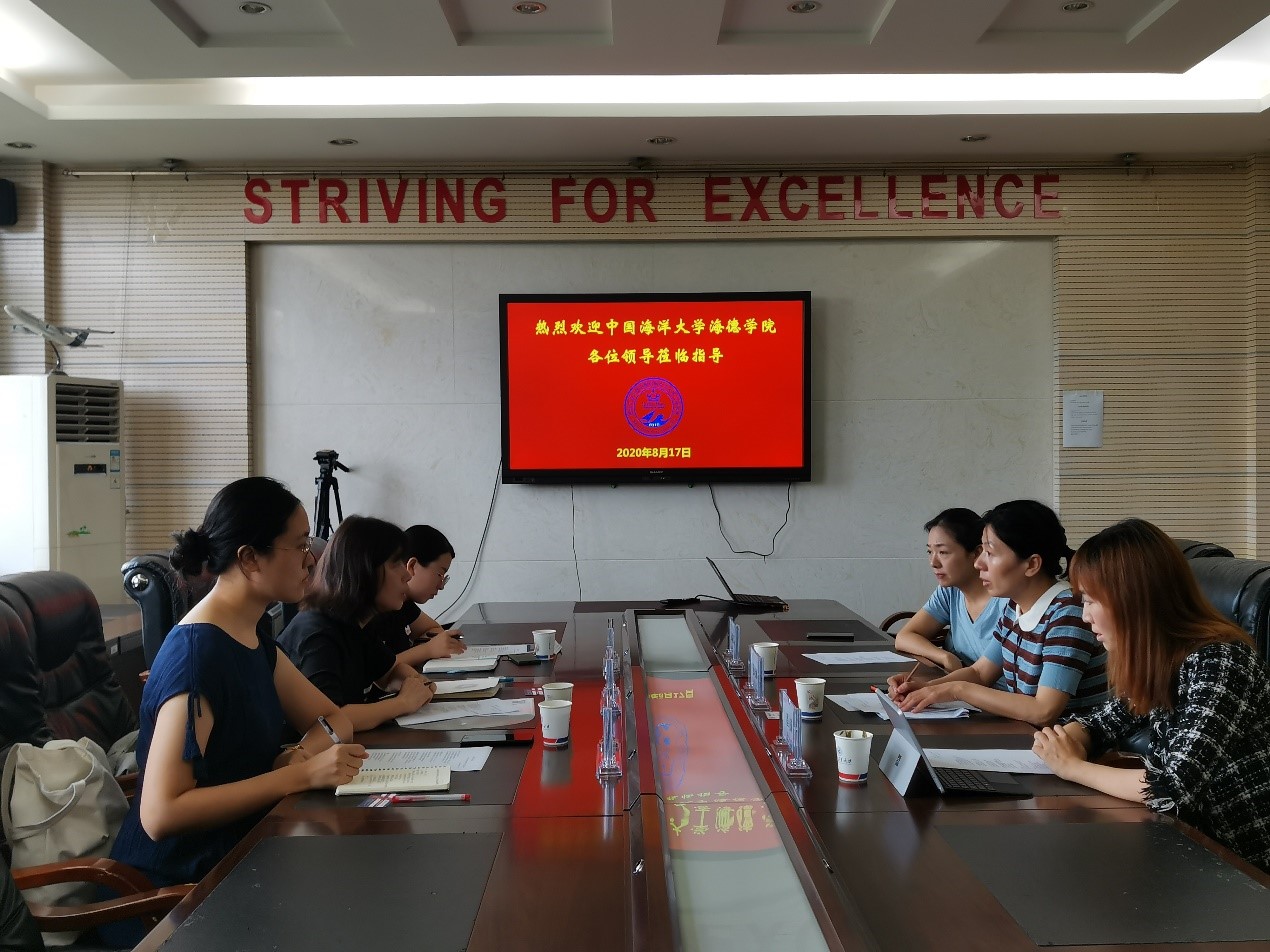 On the morning of August 17, Zhang Linjie, Associate Dean of Haide College, Ocean University of China & The University of Adelaide and her two colleagues visited QMES to conduct an investigation on the relevant work of the Sino-foreigncooperation in running schools.Vice Deans Fan Xiaoli and Cheng Yin of QMES, and Director Wu Ajing of the General Affairs Office met the guests in Meeting Room 732 of Yizi Building, Youyi Campus.