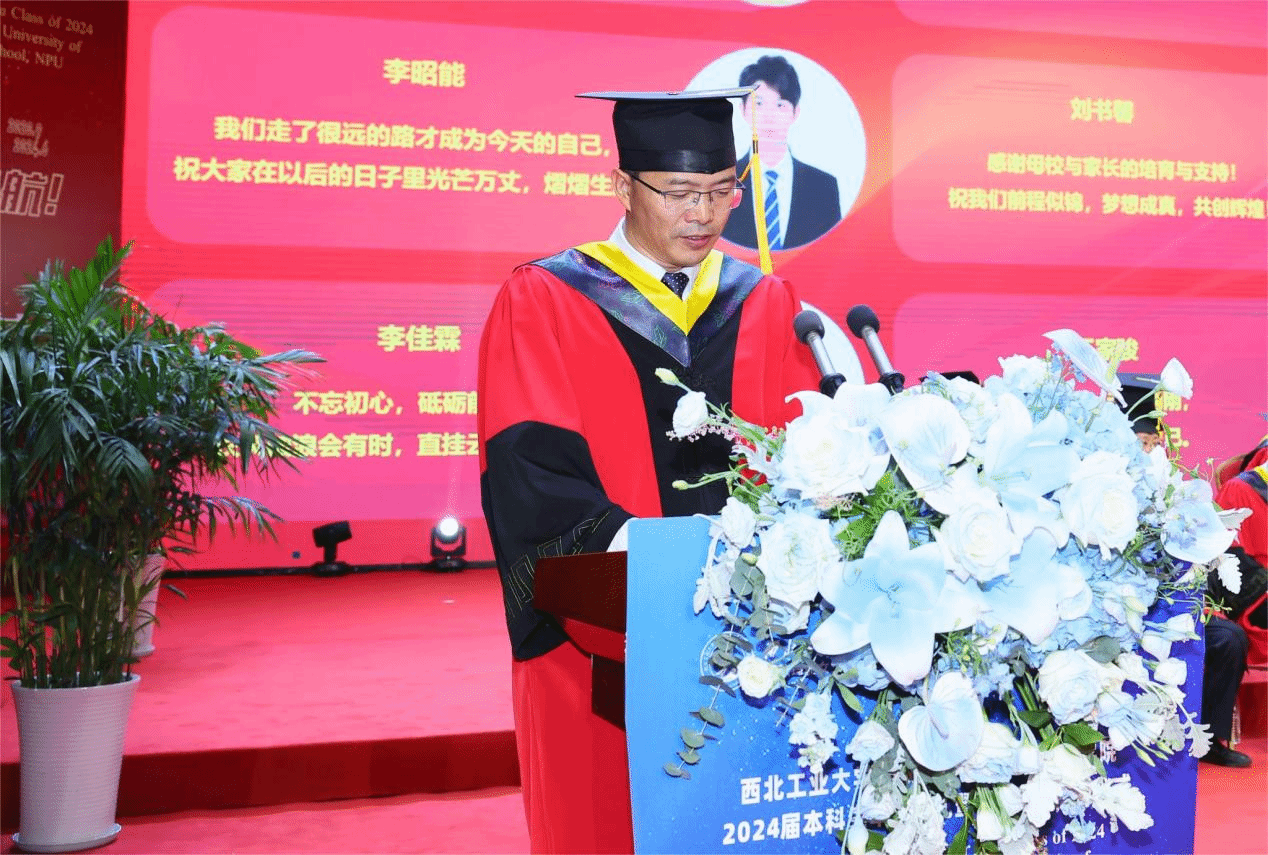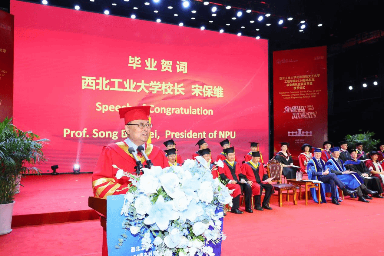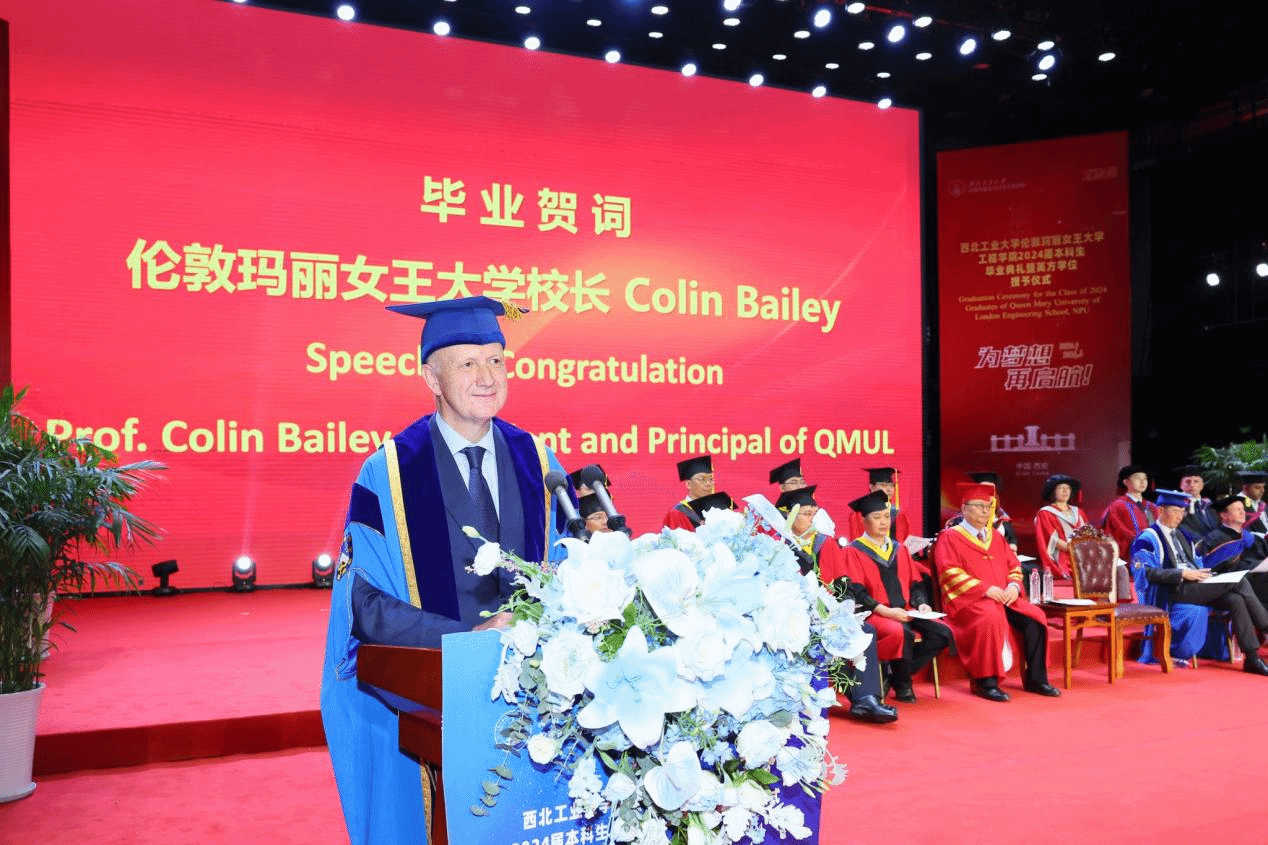 On behalf of the NPU Party Committee Secretary Li Yanrong and all the faculty and students, Song Baowei extended his heartfelt congratulations and best wishes to the graduates for completing their undergraduate studies. He also expressed gratitude to the teachers and parents from both NPU and QMUL who have long supported the development of QMES and the growth of its students. He noted that over the past four years, students have witnessed the collaborative progress between the two universities while continually pushing their boundaries and striving for excellence, achieving outstanding results in various activities. As parting advice, he offered three key hopes for the graduates: first, to aim high and have a global perspective, navigating the currents of the times with determination; second, to diligently study and innovate, striving for excellence through grounded effort; and third, to broaden their horizons and embrace the future with confidence on the global stage. Song Baowei warmly added, “Wherever you go, your alma mater will always be your most steadfast support and warmest haven. We hope you will continue to care for and support the development of your alma mater, and we look forward to welcoming you back whenever the opportunity arises.”